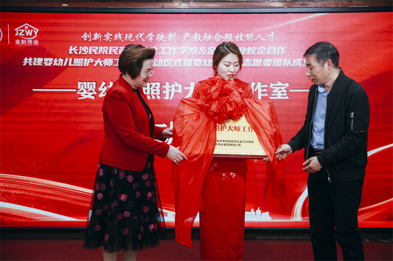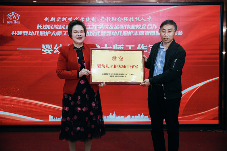 在沈宏格副院长、彭英董事长的共同揭牌下,“婴幼儿照护大师工作室”正式成立。其成立不仅是金职伟业与长沙民政职业技术学院进一步深化校企合作、产教融合的有效途径,也是教师能力提升、学生实践学习、企业创新发展的重要平台。