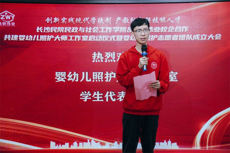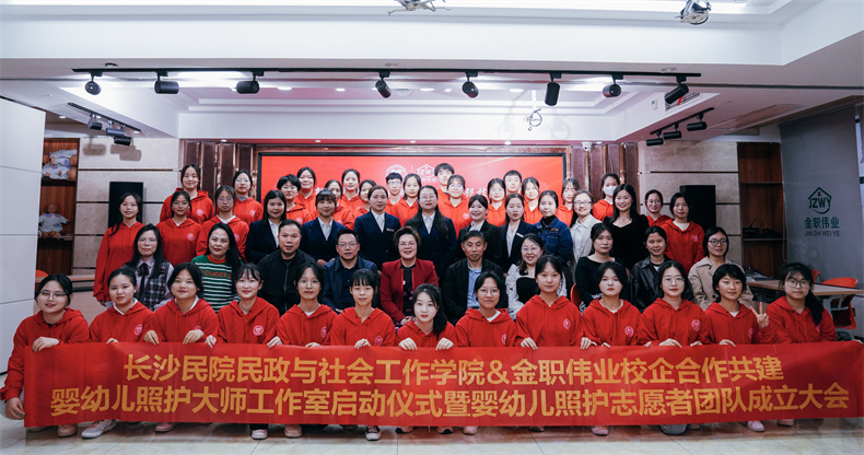 为进一步加深校企合作、产教科融合,加速校企合作的横向、纵向发展,4月11日,长沙民政职业技术学院民政与社会工作学院&金职伟业校企合作共建婴幼儿照护大师工作室启动仪式暨婴幼儿照护志愿者团队成立大会成功召开。会上,婴幼儿照护大师工作室及其志愿者团队正式成立,民政与社会工作学院学生现代学徒制拜师仪式顺利举行。