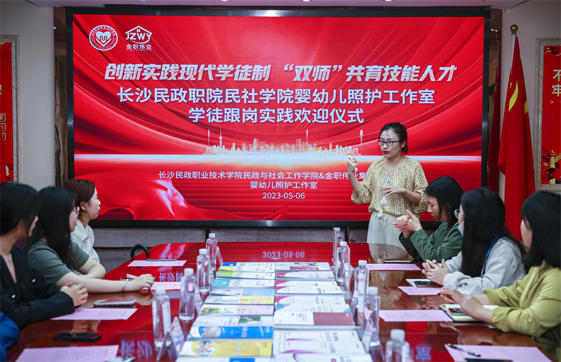 5月6日,长沙民政职院民社学院婴幼儿照护工作室6名学徒赴金职伟业开展跟岗实践活动,长沙民政职业技术学院民政与社会工作学院黄铁牛教授、金职伟业董事长助理兼品牌运营总监周娟等人出席欢迎仪式。