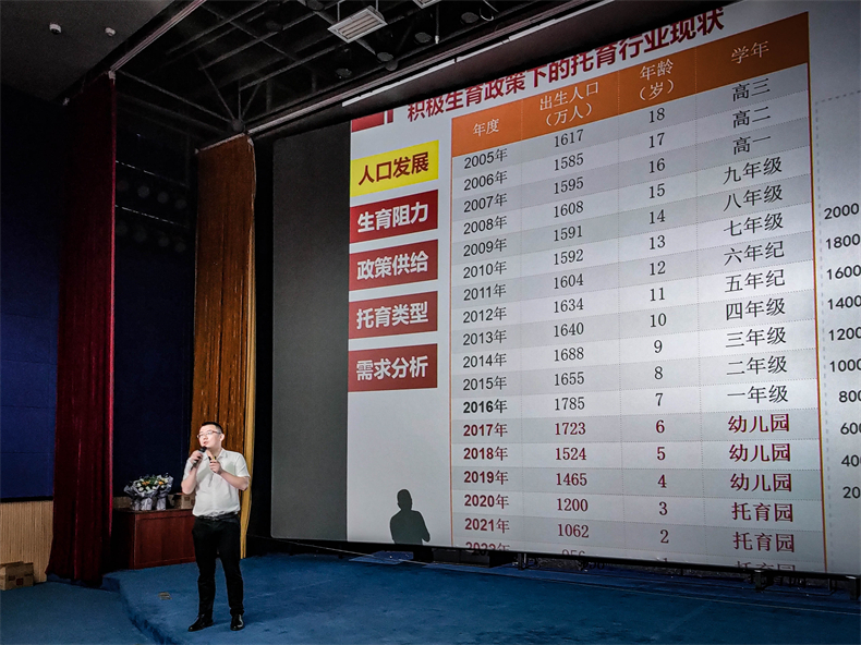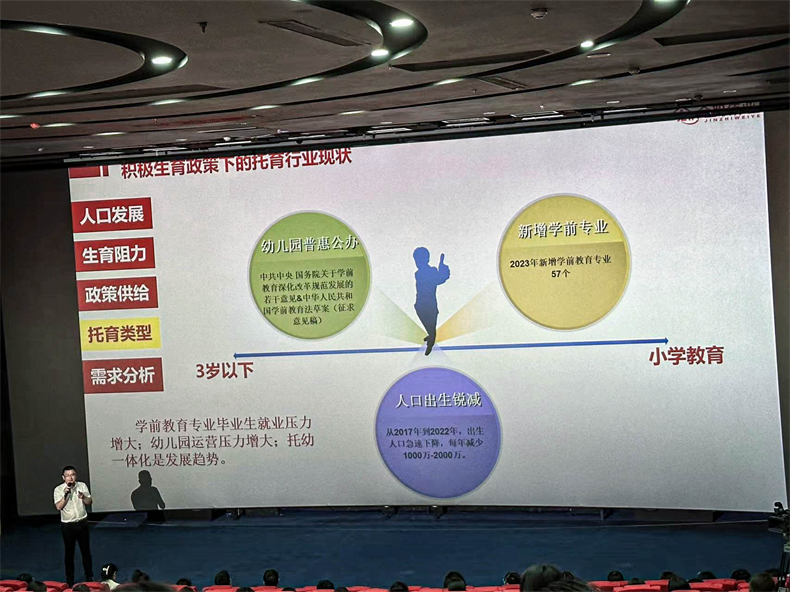 讲座中,周该生就“人口发展、生育阻力、政策供给、托育类型、需求分析”等五方面,介绍了目前国内积极生育政策下托育行业的现状,并详细分析了学前教育专业就业现状,市场供需情况、托育托幼行业发展趋势。