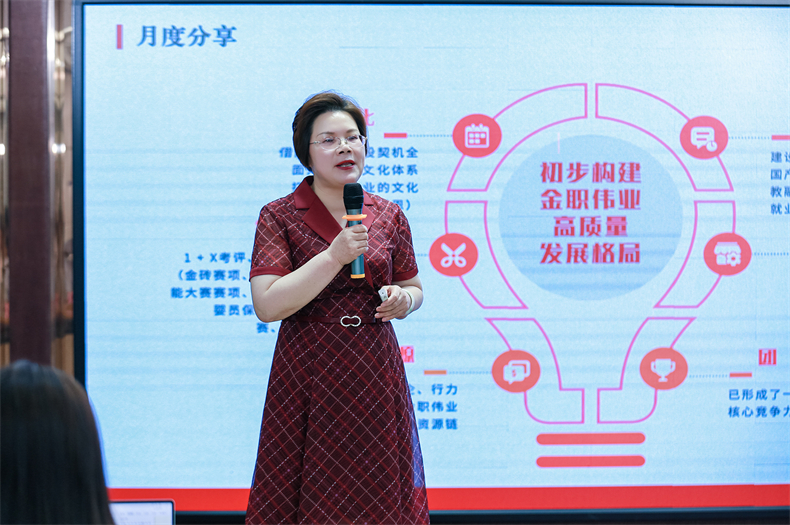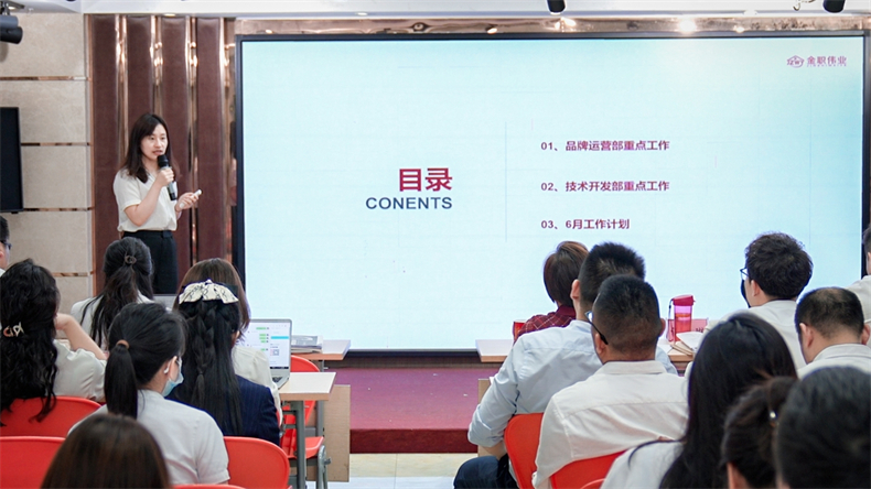 随后,她对四、五月份的工作完成情况给予了肯定,并明确了6月工作目标及工作重点,“在公司高速发展的当下,金职伟业紧跟家庭服务行业的政策导向,以1+X考评、人社考评和大赛为抓手,以家庭服务产业学院为平台,以教材资源、智慧教育产品、服务产品为推手,联动政、校、企、行力量,构建一条金职伟业优势资源链”,同时,随着新成员的源源加入,老金职人作为中坚力量,要担负起“传帮带”的职责和使命,不断提升团队凝聚力和战斗力;最后,彭英董事长还强调了金职人要打好“开源节流”组合拳,助推企业精益管理再升级。