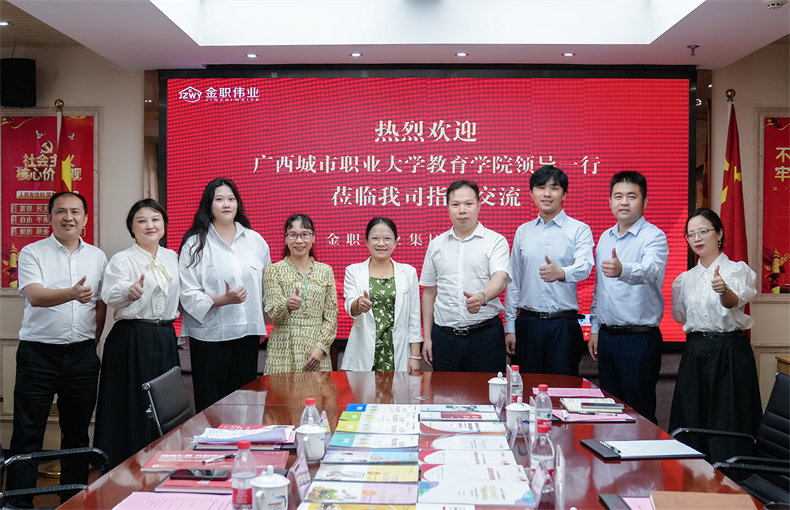 6月20日,广西城市职业大学教育学院副院长罗春霞、王永奎、教研室主任覃甲荣一行莅临我司考察交流,金职伟业总经理潘建明、院校事业部副总监刘伟等人热情接待。