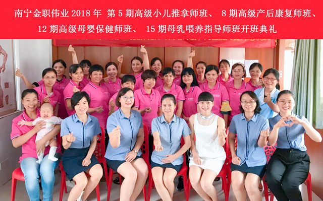 6月11日上午,南宁金职伟业职业培训学校第5期高级小儿推拿师班、第8期高级产后康复师班、第12期高级母婴保健师班、第15期母乳喂养指导师班在南宁金职伟业创业孵化基地举行开班典礼,来自湖北、广西南宁、柳州、桂林、来宾等五湖四海的姐妹们将在这里带着梦想扬帆起航。