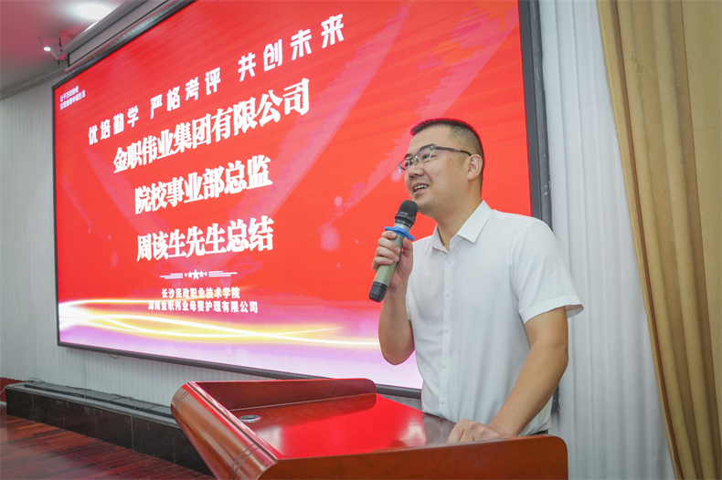 典礼伊始,金职伟业总经理潘建明讲话,“当前正处于现代职业教育体系建设改革的关键时期,教育部办公厅最新印发的《关于加快推进现代职业教育体系建设改革重点任务的通知》中,明确了打造行业产教融合共同体、建设开放型区域产教融合实践中心等11项重点任务。面对新时代发展的新要求,金职伟业将找准定位,探索自身发展路径,积极推进数字化课程教学资源开发、职业教育国家规划教材打造、职业教育校企合作典型生产实践项目建设、幼儿照护标准制定等工作,持续推动职业教育的创新发展,为高素质技能人才培养贡献力量。