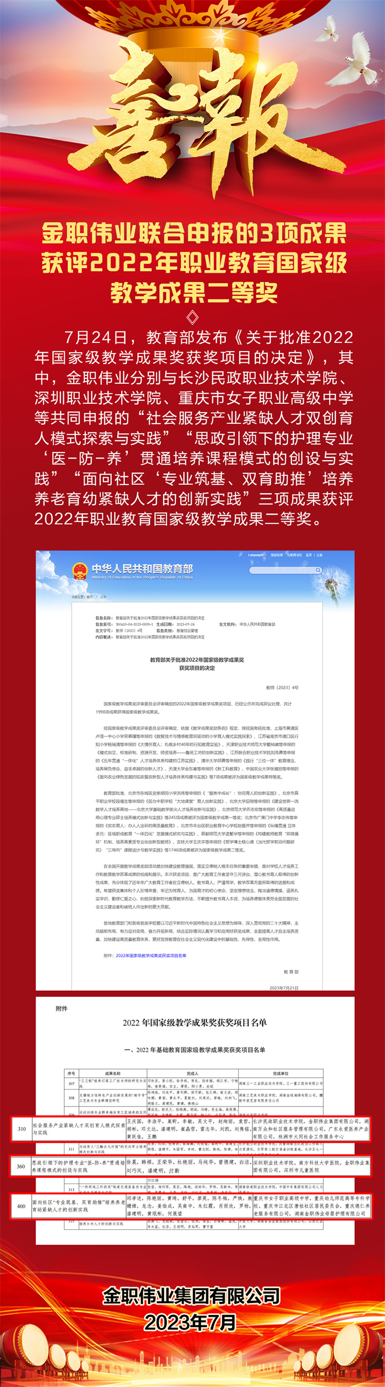 7月24日,教育部发布《关于批准2022年国家级教学成果奖获奖项目的决定》,其中,金职伟业分别与长沙民政职业技术学院、深圳职业技术学院、重庆市女子职业高级中学等共同申报的“社会服务产业紧缺人才双创育人模式探索与实践”“思政引领下的护理专业‘医-防-养’贯通培养课程模式的创设与实践”“面向社区‘专业筑基、双育助推’培养养老育幼紧缺人才的创新实践”三项成果获评2022年职业教育国家级教学成果二等奖。