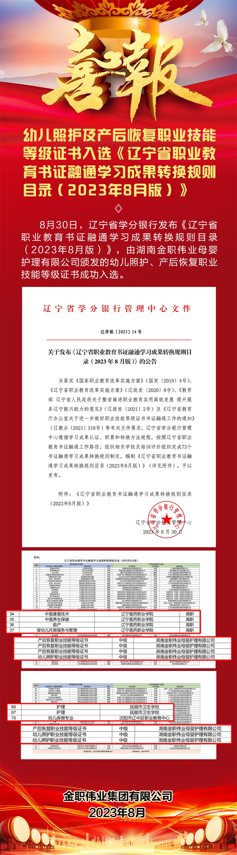 8月30日,辽宁省学分银行发布《辽宁省职业教育书证融通学习成果转换规则目录(2023年8月版)》,由湖南金职伟业母婴护理有限公司(以下简称金职伟业)颁发的幼儿照护、产后恢复职业技能等级证书成功入选。
