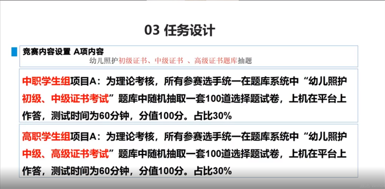 会上,谢玉琳对赛项技术规程和区域选拔赛、决赛样题进行了解读,简要介绍了大赛背景。“党的十九大,十九届四中全会都对幼有所育提出了新的要求,党的二十大指出,要深入贯彻以人民为中心的发展思想,在‘幼有所育’上持续用力。”她指出,此次大赛有国家标准领衔,采用1+X证书试点幼儿照护职业技能等级标准,拥有强大的平台支持,聚焦复合型、高素质婴幼儿照护技术技能人才培养。另外,对于大赛中中职组、高职组与教师组在赛题的任务设计、分数设置等方面存在的区别,她也进行了详细阐述,进一步明晰了不同组别参赛选手的大赛方向。