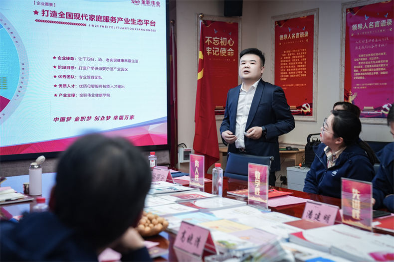 考察团一行实地观摩了金职伟业旗下职业培训学校产教融合型门店、托育综合服务中心、1+X幼儿照护实训基地、金职伟业家庭服务产业学院与全国婴幼儿照护服务产教融合共同体办公区,并通过听取金职伟业总经理助理汤曌宇的讲解,深入了解了金职伟业的企业文化及运营模式,对金职伟业立足母婴领域,扎实开展技能人才培养与评价工作大加赞赏。