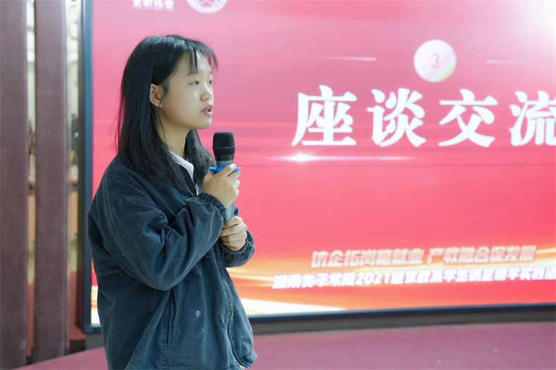 座谈交流环节,金职伟业在职人员——湖南女子学院往届学姐结合自身经历向即将毕业的学妹们分享了几点建议,期待她们在不断探索新事物的过程中明确职业发展方向,做好未来职业规划。在座学生就金职伟业运营发展壮大的内在逻辑向周丹请教,周丹热情回应,为学生答疑解惑。