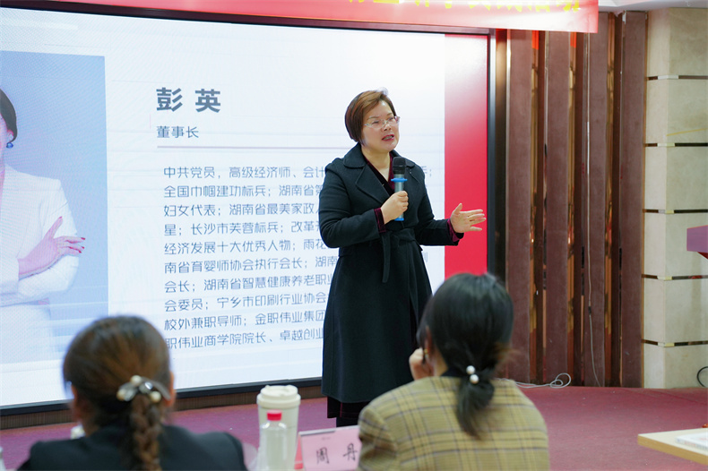 金职伟业董事长彭英对大家的到来表示热烈欢迎,她谈到,此次访企研学活动,进一步拉近了校企的距离,促进了校企更深层次的交流沟通。她提到,“一老一小”是关系保障和改善民生、促进国家长治久安、增强大国发展韧性的大事。现今,人口老龄化趋势显著、婴幼儿出生率逐渐下降,家庭服务领域人才已成为国家紧缺人才,家庭服务领域行业拥有广阔的市场前景。“人才是第一资源,创新是第一动力,人才的进入对企业发展意义重大,期待在座各位来金职伟业学习实践,为自身发展赋能。”