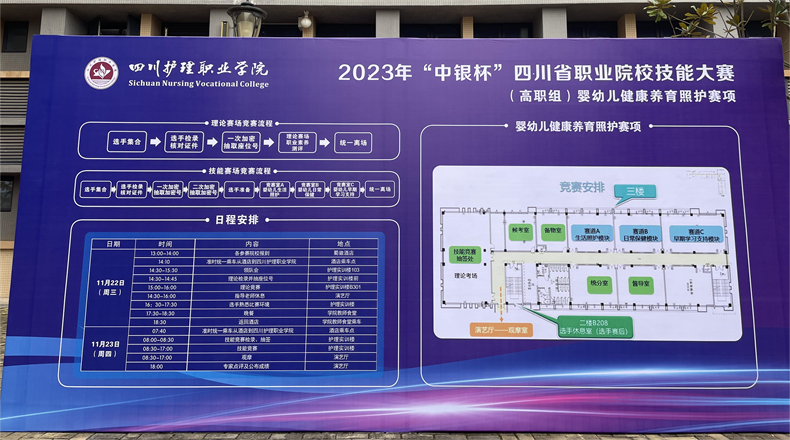 11月22日-23日,由四川省教育厅主办的2023年“中银杯”四川省职业院校技能大赛(高职组)婴幼儿健康养育照护赛项在四川护理职业学院顺利举办。来自四川省各校的17支队伍、34名选手参加此次竞赛。