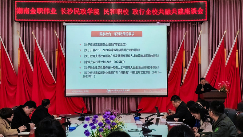 现代家政服务与管理优质专业群内涵建设培训会上,长沙民政职业技术学院黄铁牛教授围绕产教融合专业建设作主题报告。他强调,新修订的职业教育法明确将产教融合作为一个基本制度提出来,并规定职业教育发展必须坚持“产教融合、校企合作”。