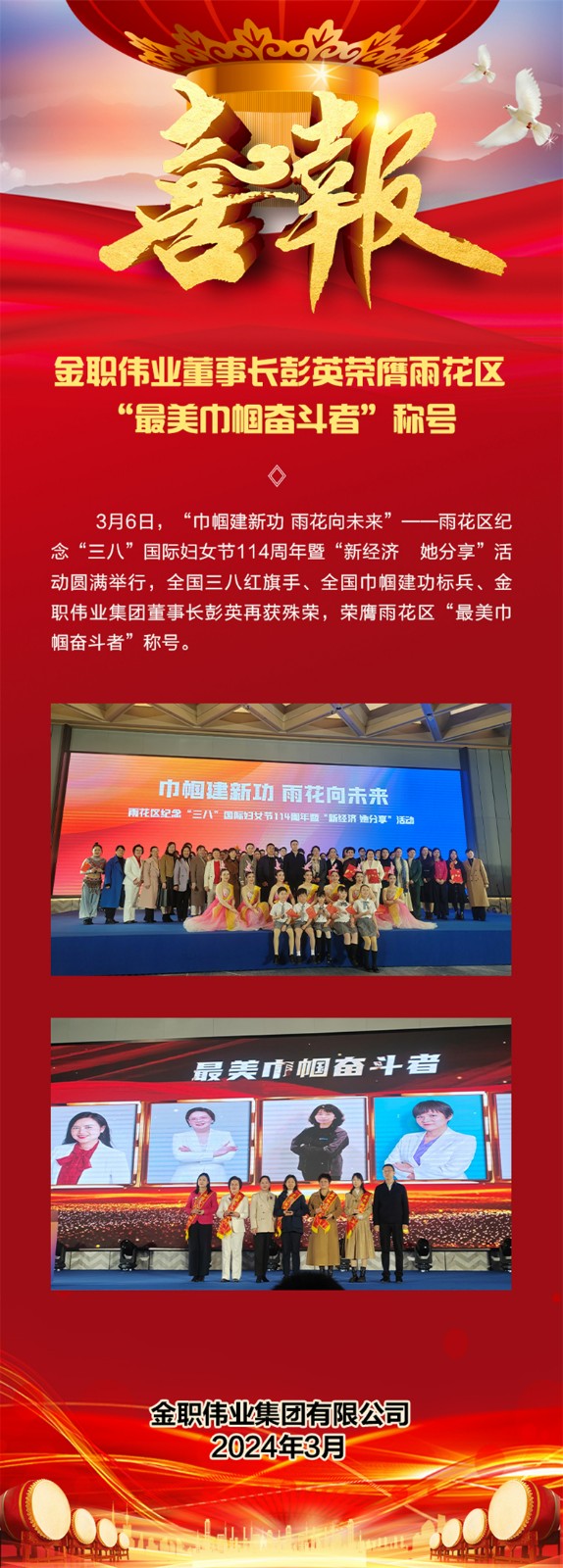3月6日下午,“巾帼建新功 雨花向未来”——雨花区纪念“三八”国际妇女节114周年暨“新经济 她分享”活动圆满举行,全国三八红旗手、全国巾帼建功标兵、金职伟业集团董事长彭英受邀出席并荣获雨花区“最美巾帼奋斗者”称号。