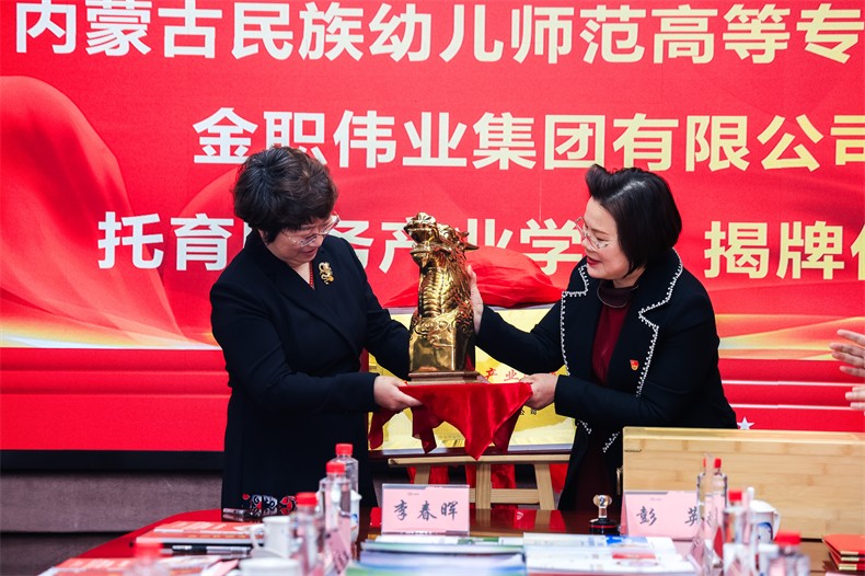 为提升职业院校和企业、行业的合作质量,进一步推进产教融合创新发展,提升校企协同育人质量,助力高素质“双师型”教师队伍建设,赋能人才培养。座谈会同期举行了金职伟业集团与内蒙古民族幼儿师范高等专科学校共建托育服务产业学院签约及揭牌仪式。