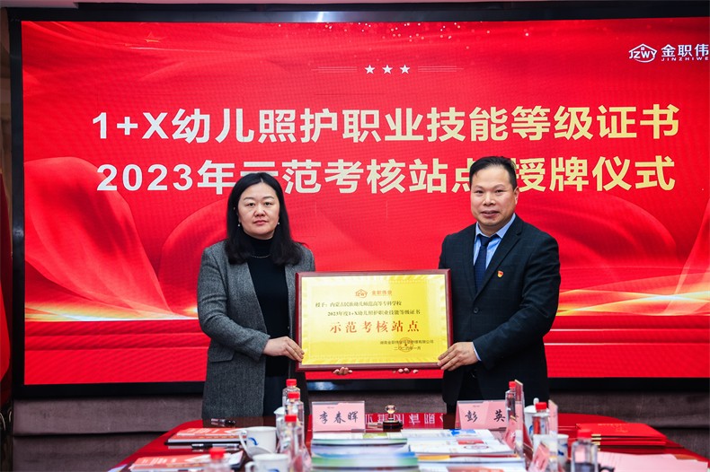 随后,金职伟业集团授予内蒙古民族幼儿师范高等专科学校“1+X幼儿照护证书示范考核站点”牌匾,以表彰学校在1+X幼儿照护证书方面的工作成果。双方纷纷表示,下一步将整合师资、课程、实训资源,发挥各自优势,积极推进课证融通,以1+X幼儿照护证书为切入点,进一步促进相关专业群改革发展,提高毕业生就业竞争力,增强社会服务能力。