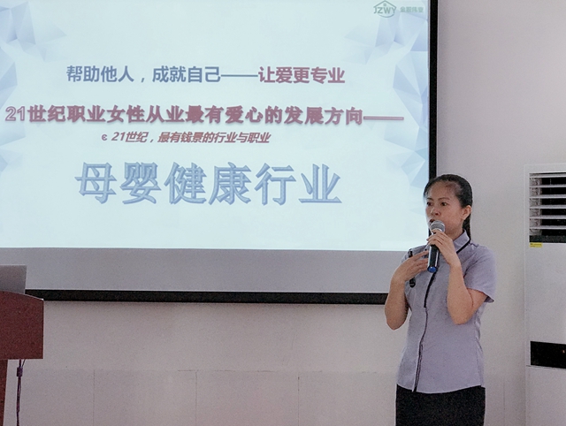 南宁金职伟业总监黄洁女士出席开班典礼并致辞。她欣喜于越来越多的姐妹立志投身母婴行业,感慨这个行业逐渐获得市场青睐,感恩来自全国各地的姐妹对南宁金职伟业的信任。