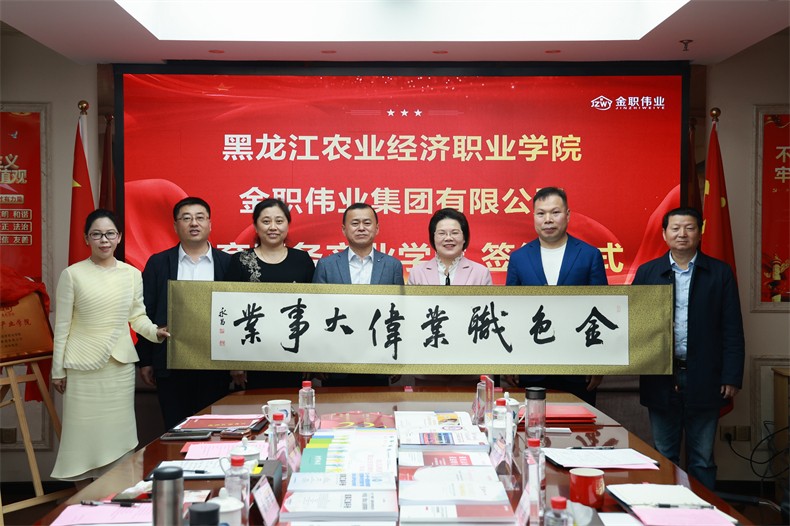 随后,聂洪臣与彭英签署了共建托育服务产业学院协议并共同为产业学院揭牌。值得一提的是,黑龙江农业经济职业学院特赠送金职伟业一幅题写了“金色职业 伟大事业”八个大字的书法作品,祝愿金职伟业事业蓬勃发展,日胜一日!