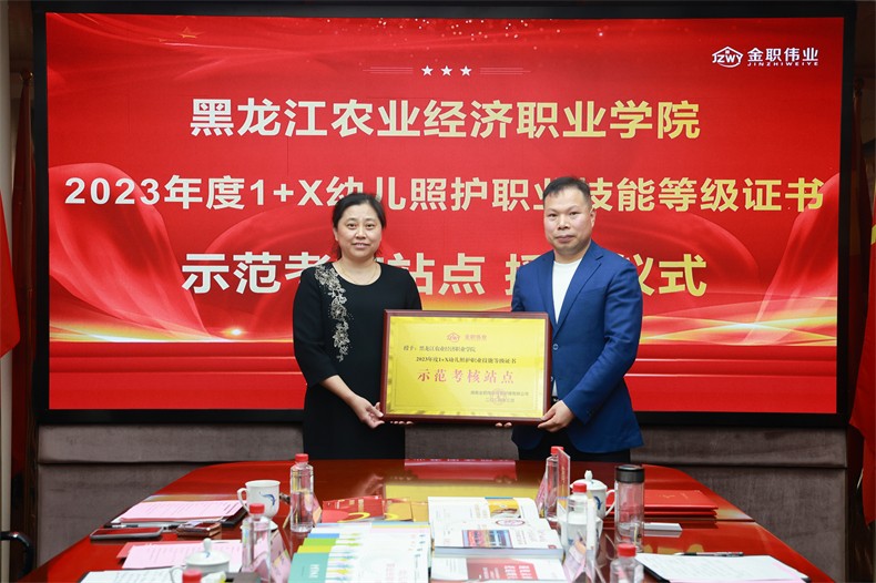 会议最后,金职伟业集团授予黑龙江农业经济职业学院“2023年度1+X幼儿照护职业技能等级证书示范考核站点”牌匾,以表彰学校在1+X幼儿照护证书方面的工作成果。双方表示,下一步将整合双方资源,发挥各自优势,以1+X幼儿照护证书为抓手,提高毕业生就业竞争力,增强社会服务能力。