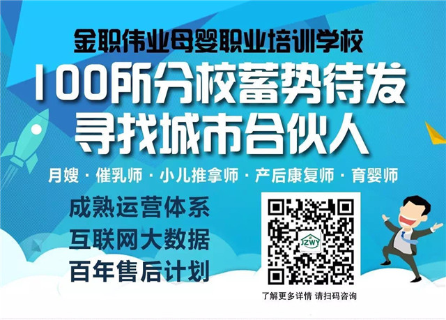 未来三年,金职伟业将在全国各地开设100家分校,为全国提供有专业保障的母婴服务人才;在全国各地市开设500家母婴服务门店,为母婴人群提供专业的母婴技能服务。现在,公司正在面向全国招募有志于母婴职业培训和母婴服务市场的合作伙伴,我们热忱期待您的加入。