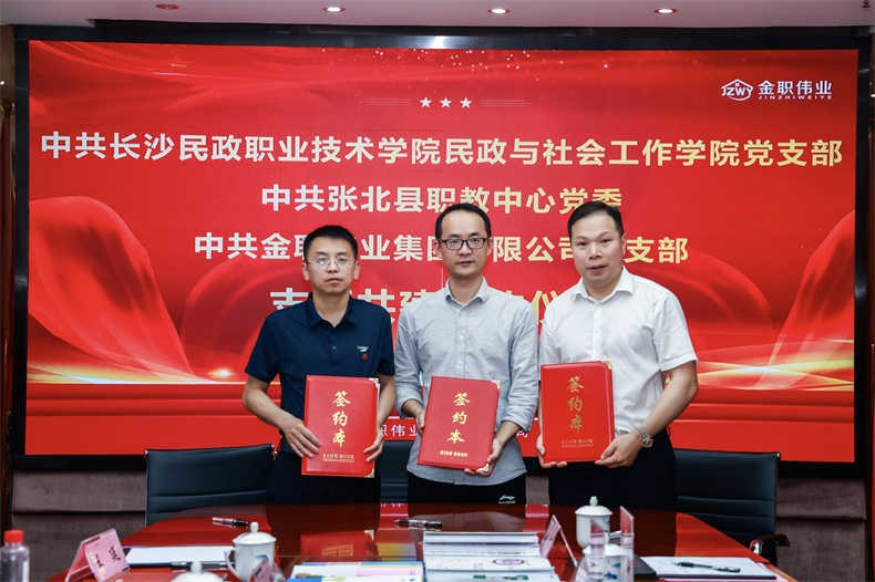 为进一步深化党建引领作用,构建“资源共享、发展共赢”的党建工作新格局,座谈会后,中共长沙民政职业技术学院民政与社会工作学院党总支、中共张北县职教中心党委、中共金职伟业集团有限公司党支部签订了支部共建协议。