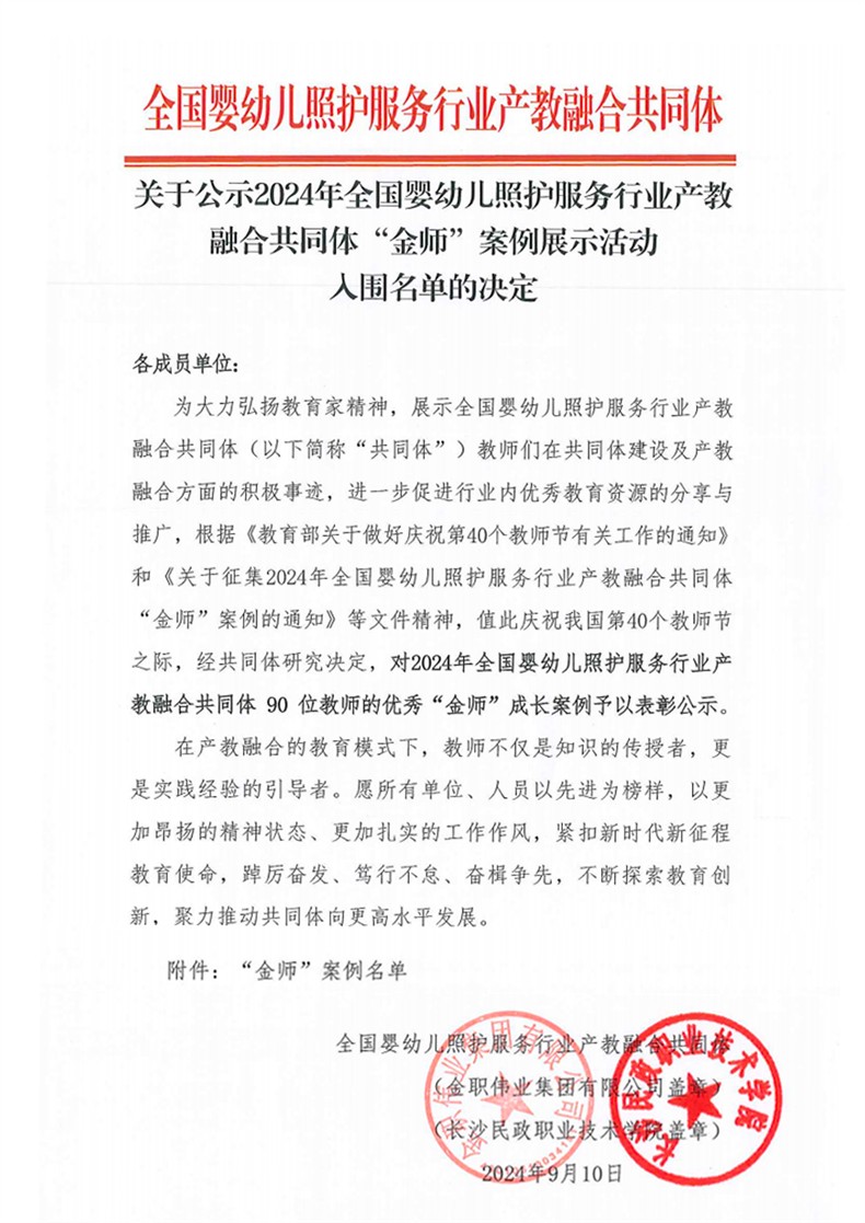 在第40个教师节来临之际,为贯彻落实教育部《关于做好庆祝第40个教师节有关工作的通知》文件要求,大力弘扬教育家精神,展示全国婴幼儿照护服务行业产教融合共同体教师风采与风貌(以下简称“共同体”),近日,共同体发布《关于征集2024年全国婴幼儿照护服务行业产教融合共同体“金师”案例的通知》。