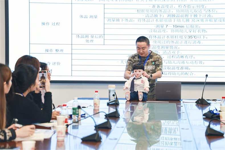 作为大赛联合承办单位,金职伟业为此次赛事提供了专业平台支持与智慧模型产品支撑。理论考试婴幼儿照护综合知识测评模块依托金职伟业自主研发的金职母婴考评一体化平台进行,平台集试题批量导入、多题型导入、随机组体抽卷、多裁判同步在线独立评分与实时监考等多功能一体,其便捷性与高效化的特色充分保障了理论考核的顺利开展。实操考核中,金职伟业智能仿真幼儿再次亮相赛场,以高度智能化、灵敏化为赛事赋能,保障了大赛的顺利进行。