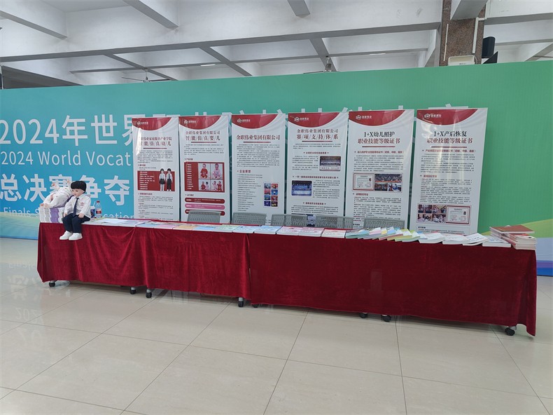 比赛同期开设了展厅展览,金职伟业在展位精彩呈现了近年来系列成果产品,包括联合院校专家编写的幼儿照护、产后恢复、家政行业、托育行业及课证融通系列教材;自主研发的智能仿真幼儿、智能仿真婴儿、婴幼儿照护混合现实训练系统(MR)、婴幼儿照护职业技能虚拟仿真实训系统(VR)等校企合作发明专利、智慧职教产品;全国职业院校技能竞赛、一带一路暨金砖国家技能发展与技术创新大赛等大赛成果转化案例丛书。