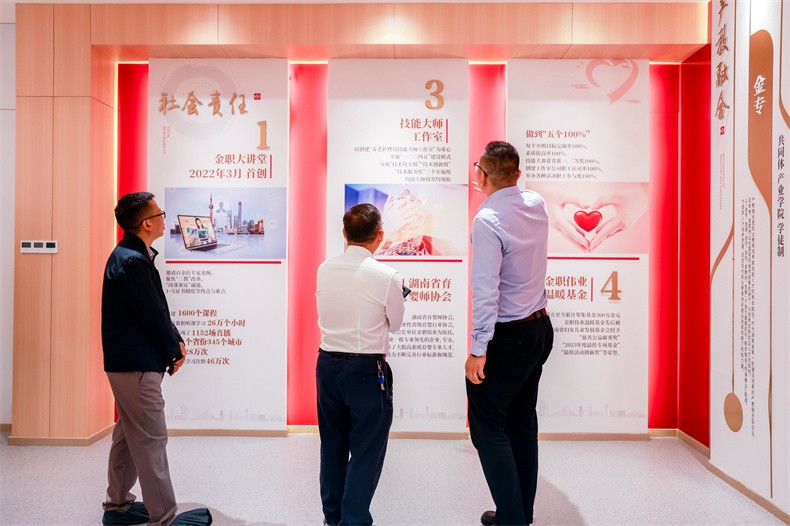 金职伟业集团总经理潘建明对屈校长一行的到来表示热烈欢迎,并详细介绍了集团创业历程、团队建设及取得的成就。他提到,“新双高”建设为校企合作指明了方向,双方应携手并进,深化产教融合,以行业视角推动职业教育发展,同时利用院校优势赋能行业。他表示,金职伟业集团期待在屈校长的指导下,不断加深与湖南环境生物职业技术学院的校企合作,全力以赴,共赢发展。