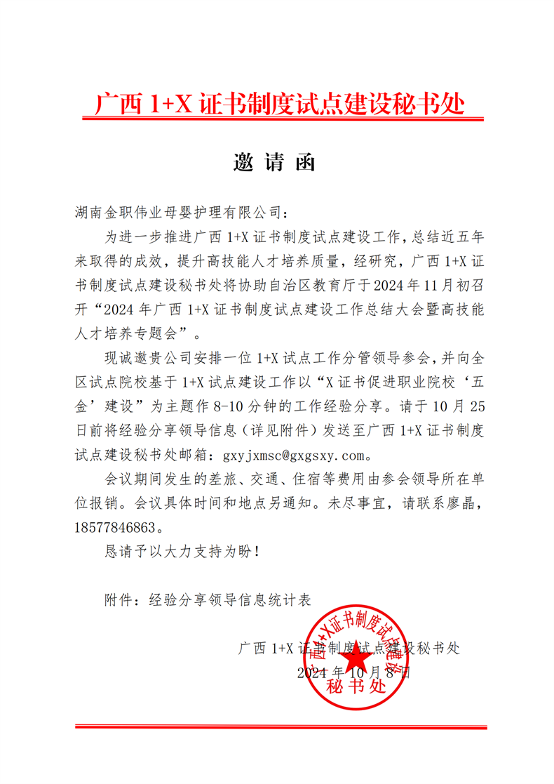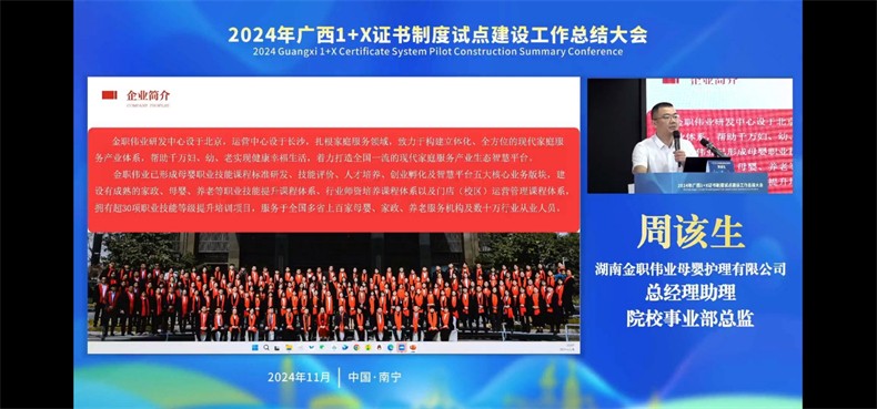11月8日,由广西壮族自治区教育厅主办、广西1+X证书制度试点建设秘书处、广西工商职业技术学院承办的2024年广西1+X证书制度试点建设工作总结大会在南宁召开。此次会议旨在总结广西1+X证书制度试点建设工作经验,助力广西职业教育改革与发展,作为1+X证书制度试点第三批、第四批幼儿照护、产后恢复职业技能等级证书职业教育培训评价组织,湖南金职伟业母婴护理有限公司总经理助理兼院校事业部总监周该生受邀参会并作分享。
