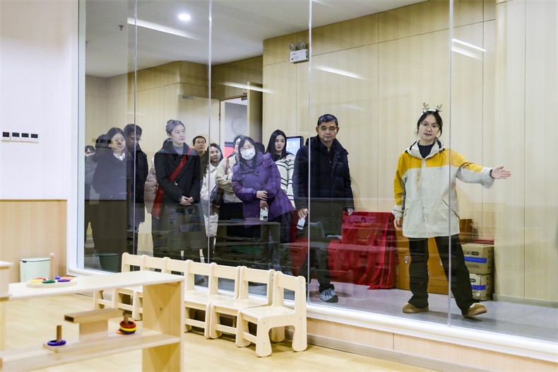 刘铁芳院长一行细致参观了金职伟业现代家庭服务产教融合实践中心以及长沙市雨花区托育综合服务中心。他们详细询问了中心的设施设备情况、办园理念以及环境创设情况,对金职伟业在产教融合、园所建设方面所取得的实践成果及工作路径有了深入了解。