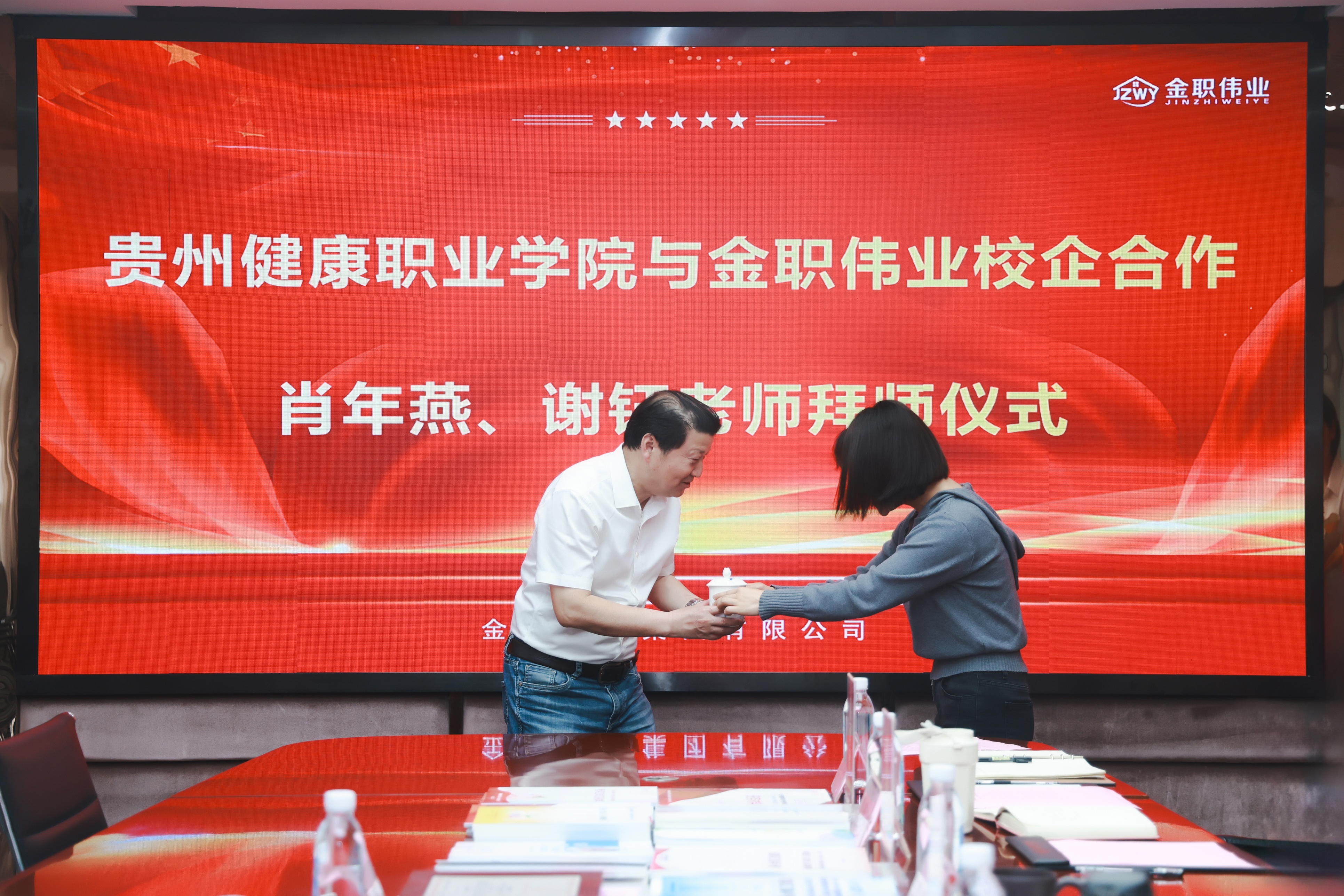 5月7日,贵州健康职业学院与金职伟业校企合作暨肖年燕、谢钰老师拜师仪式顺利举行。金职伟业集团有限公司总经理潘建明、教研中心总监谢玉琳、邵汉清,产业学院院长刘潇、教研中心主任陈万方、副主任李偲婧参加活动。