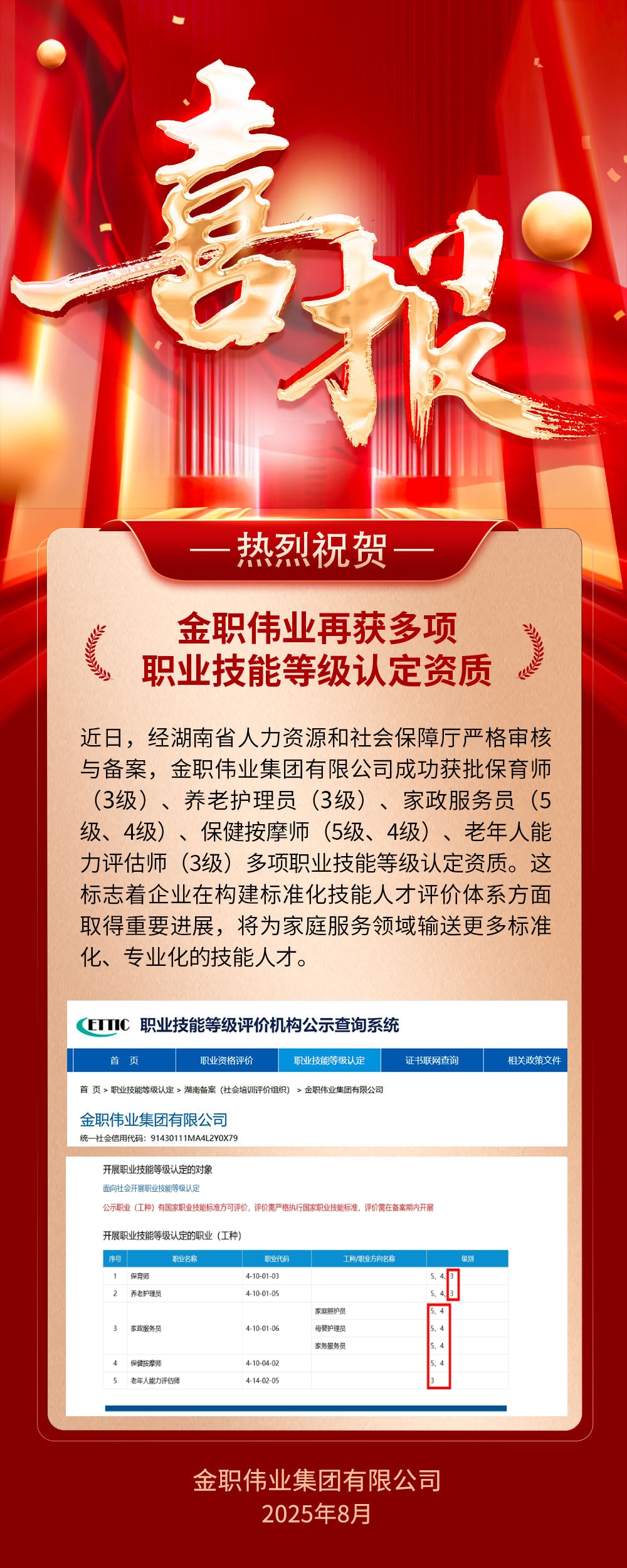 近日,经湖南省人力资源和社会保障厅严格审核与备案,《2025年湖南省第一批职业技能等级认定社会培训评组织晋级增项职业(工种)名单》公布,金职伟业集团有限公司成功获批保育师(3级)、养老护理员(3级)、家政服务员(5级、4级)等多项职业技能等级认定资质。这一重要突破,标志着企业在构建标准化技能人才评价体系方面取得战略性进展,将为社会输送更多标准化、专业化的技能人才提供有力支撑。