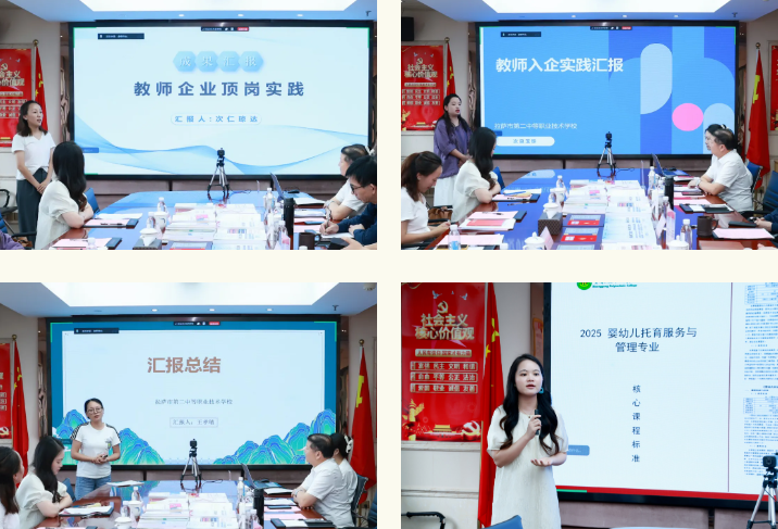 成果汇报环节,次仁琼达、次旦玉珍、王孝敏、丁可盈四位教师依次登台,围绕自己在金职伟业集团3-4个月的顶岗实践经历,全方位分享了各自的实践历程与深刻体悟。她们紧扣行业发展脉搏、企业文化内核、园所岗位实操、专业建设反思、技能竞赛指导、科研能力跃升及个人职业规划等多重维度,生动诠释了如何将企业实践中汲取的新知、技术、标准与流程,创新性地转化为教学项目、课程模块与实训方案。教师们一致认为,此次“沉浸式”顶岗实践堪称一次宝贵的“回炉再造”,极大拓宽了视野,锤炼了解决实际问题的能力。发言中,她们特别感恩金职伟业集团提供的丰厚产教资源,感恩金职伟业资深导师团队的倾囊相授与鼎力支持,坦言这对自身专业精进与未来发展收获巨大。