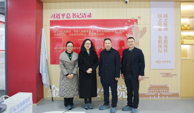 2025年12月21日,中华全国工商业联合会养老与家政服务业委员会轮值主席于晓怡、关爱健康管理服务有限公司董事长唐勤莅临金职伟业集团有限公司(以下简称“金职伟业”)调研指导,实地考察养老与家政人才培养实践成果,金职伟业总经理潘建明博士、董事长助理兼产品运营中心总监周该生全程陪同。