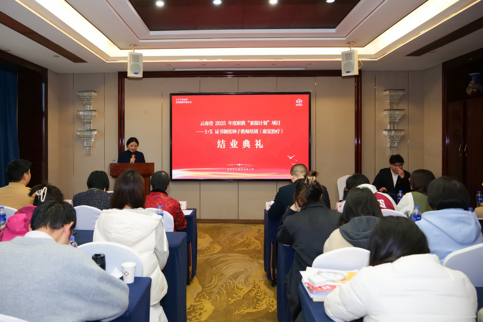 12月23日,2025年度云南省职教“素质提高计划”项目——1+X证书制度种子教师培训(康复治疗)结业典礼在红星国际酒店五楼麓山厅隆重举行。原长沙民政职业技术学院康复治疗系主任田莉女士,原永州职业技术学院护理学院院长、金职伟业集团有限公司特聘专家谢玉琳女士,金职伟业集团有限公司董事长助理兼产品运营中心总监周该生先生出席典礼,与全体参训康复治疗专业教师共同见证培训圆满收官。