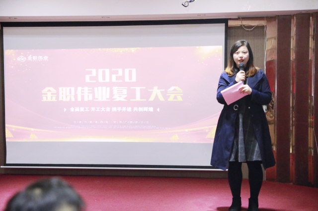 2020年3月23日上午11点,在金职伟业创业孵化基地举行了隆重的2020年度复工大会。此次大会由金职伟业综合部主任代玉芬女士主持,全体金职伟业人欢聚一堂,其乐融融。
