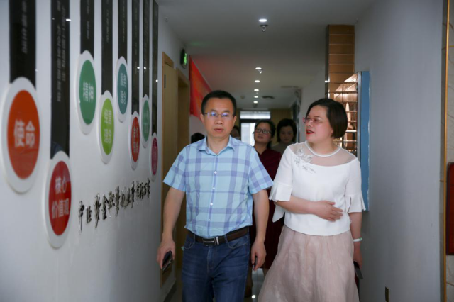 刘勇军、刘菁两位处长在彭董的带领下先后参观了培训学校、教职员工办公室、多功能教室、公司走廊文化墙以及旗下金婴丽人一站式母婴体验馆等各个场地。对金职伟业的发展历程、企业理念、师资力量、现有发展规模和三年公司战略做了初步的了解。