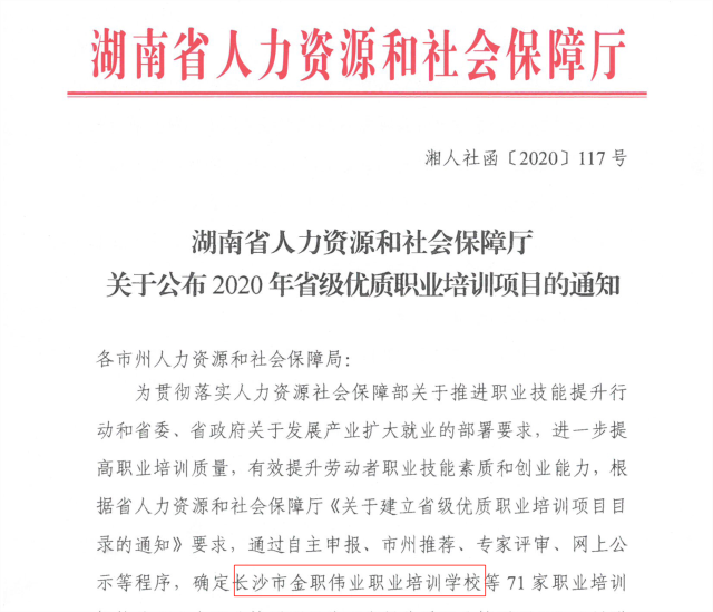 近日,湖南省人力资源和社会保障厅先后印发《关于公布2020年省级优质职业培训项目的通知》、《关于推荐省级职业技能培训线上平台机构的通知》,金职伟业育婴员培训、养老护理员培训共同入选2020年湖南省优质培训项目,金职伟业平台入选湖南省级线上平台机构。