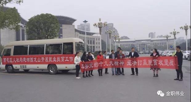 “要精准扶贫,切忌喊口号,也不要定好高骛远的目标”。金职伟业在助力精准扶贫工作中,求真务实,稳扎稳打,力求落到实处。10月23日,雨花区人社局赴湘西龙山开展就业扶贫工作,金职伟业总裁潘建明先生作为就业单位代表随同前往湘西。
