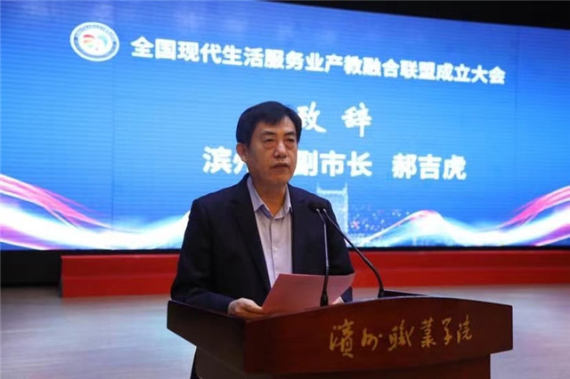 滨州市副市长郝吉虎发表致辞,他指出,全国现代生活服务业产教融合联盟的成立,旨在为学校、行业协会、企业和有关部门搭建合作交流平台,进一步加强家政服务人才培养培训工作,开启新形势下合作发展的序幕。