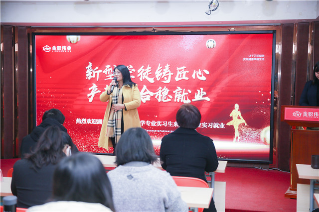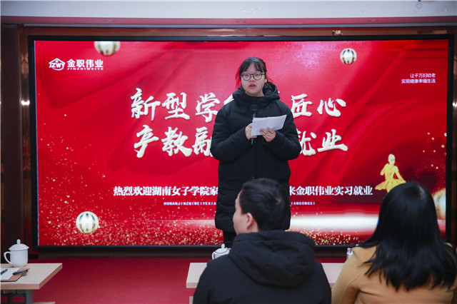 湖南女子学院家政专业学子帅馨儿作为优秀实习生代表进行发言。她表示很感谢金职伟业和湖南女子学院提供此次实习机会,她也代表全体学生作出保证,在实习期间一定会遵守公司的规章制度,听从安排,并摆正心态,积极请教同事及领导。
