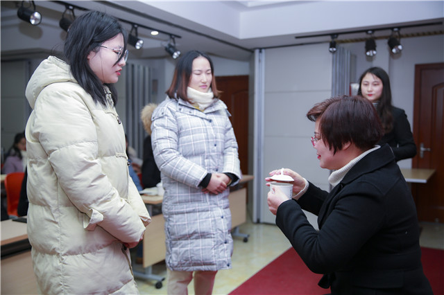 肖海丹、朱婉容作为学徒代表向金职伟业董事长彭英敬茶,拜师仪式圆满礼成。