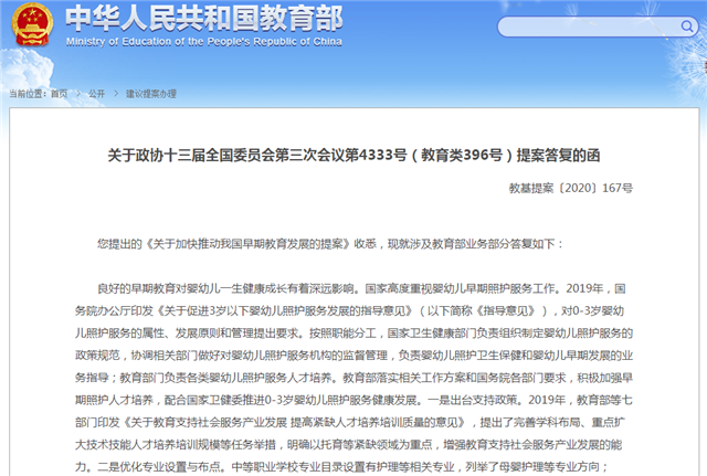 幼儿照护证书列入政协十三届委员会第三次会议提案答复函