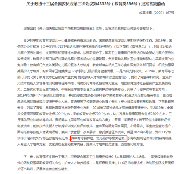 提案答复函中指出,贯彻落实《国家职业教育改革实施方案》,开展“学历证书+若干职业技能等级证书”制度试点,创新技术技能人才培养培训模式和评价模式,重点围绕服务国家需要、市场需求、学生就业能力提升,面向托育等技能人才紧缺领域,落实“放管服”改革要求,稳妥推进证书试点。截至2020年6月份,发布73个培训评价组织的92个职业技能等级证书,其中有母婴护理、幼儿照护等相关证书。