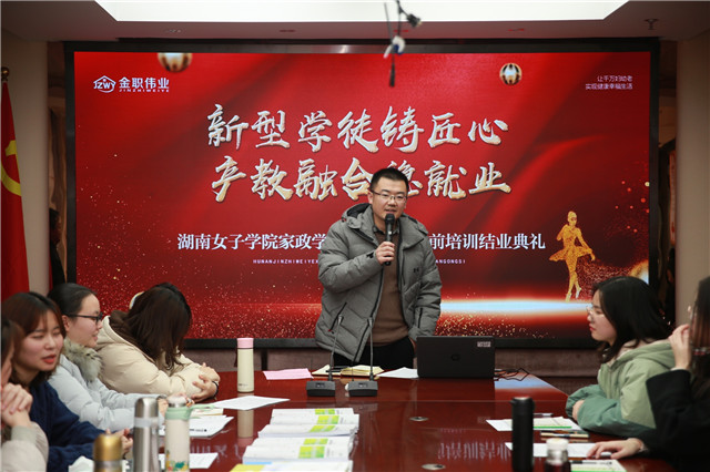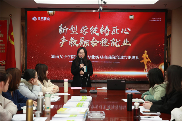 12月18日下午,湖南女子学院家政学专业实习生岗前培训结业典礼在长沙金职伟业职业培训学校内顺利举行。金职伟业总经理潘建明、大市场总监周娟、1+X幼儿照护运营总监周该生及各部门领导出席了此次典礼。