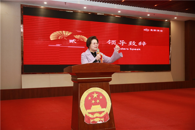 湖南金职伟业集团董事长彭英致欢迎词。她首先对各位领导、学员的到来表示热烈欢迎,并表示,在今后,金职伟业将继续积极响应国家家政服务业提质扩容政策号召,保障基本民生,让更多贫困家庭女性、农村富余妇女劳动力、低保贫困户建档立卡户掌握就业技能,提高当地群众就业、创业能力,实现一人就业全家脱贫。