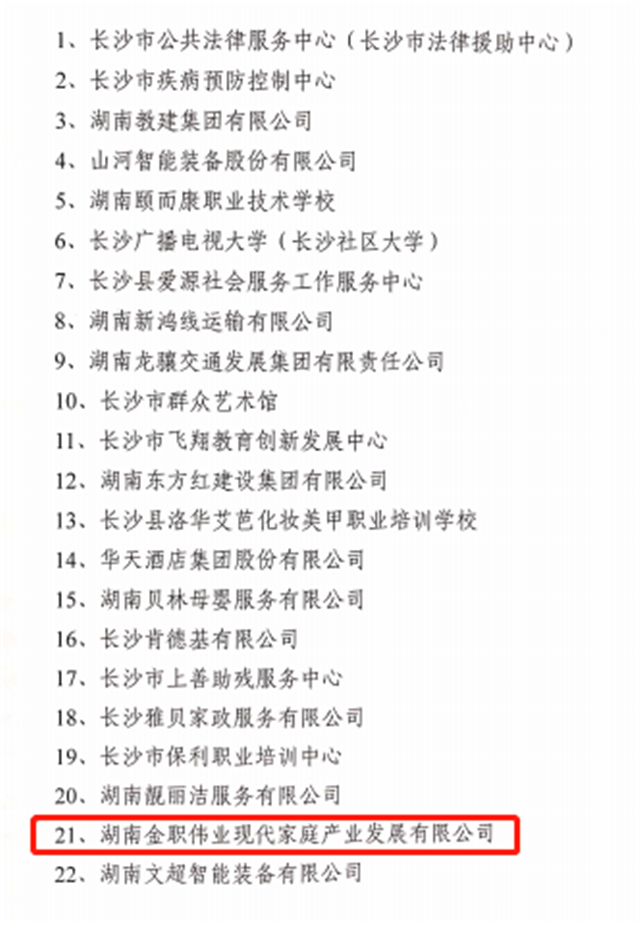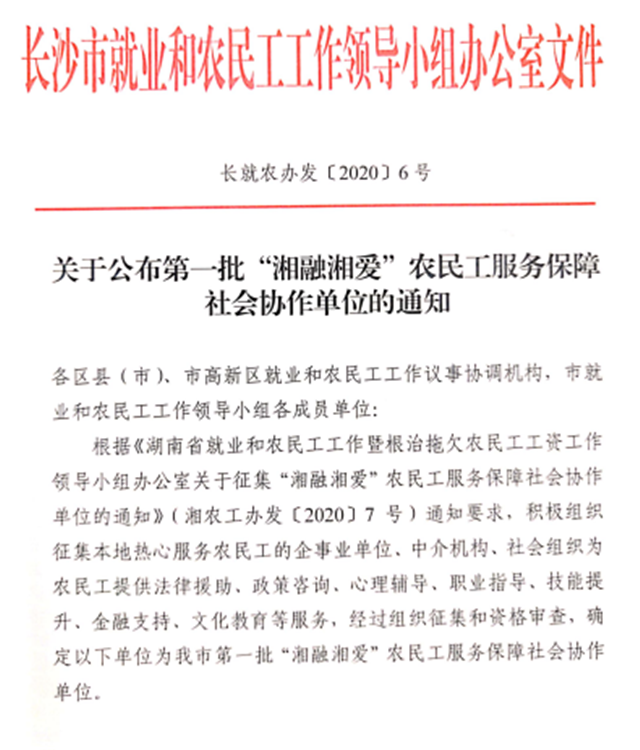 近日,长沙市就业和农民工工作领导小组办公室发布《关于公布第一批“湘融湘爱”农民工服务保障社会协作单位的通知》,金职伟业成功入选第一批“湘融湘爱”农民工服务保障社会协作单位。