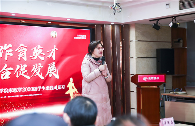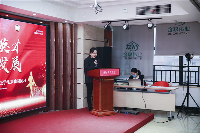 活动伊始,金职伟业董事长彭英致欢迎词。她首先对来到金职伟业进行专业见习的九十余名优秀学子表示热烈欢迎,并对各位领导的莅临表示衷心地感谢。随后,彭总分享了三点内容,其一,感恩长沙民政职业技术学院对于金职伟业长期以来的大力支持。其二,在未来,希望能够与长沙民政职业技术学院继续深度合作,推动职业教育不断发展。其三,希望各位学子能够拥有五种力量:学习、同学、榜样、美、感恩,在今后为社会作出更大的贡献。