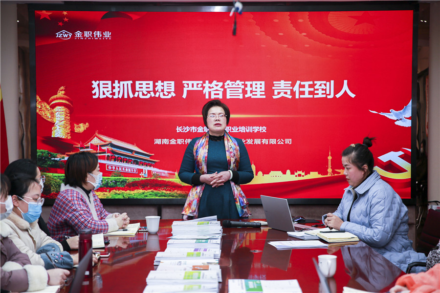 会上,金职伟业集团董事长彭英分享了以下三点:其一,在2021年,金职伟业仍将紧跟国家政策,依托政府平台,大力帮助社会失业者、高校毕业生、残疾人等九类人员提升职业技能,促进其更快就业;其二,希望在座每位老师经过今天的学习,了解相关政策及培训指导意义,明确方针,严格按照文件要求开展好职业技能培训工作;其三,金职伟业将紧跟党的步伐,真正做到国家政策与金职战略相结合,促就业,稳就业。