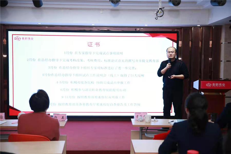永州职业技术学院教务处常务副处长胡红宇教授对于金职伟业1+X团队全体成员所做出的努力表示高度认可,他也希望在金职伟业董事长彭英、总经理潘建明的带领下,金职伟业的发展更上一层楼。
